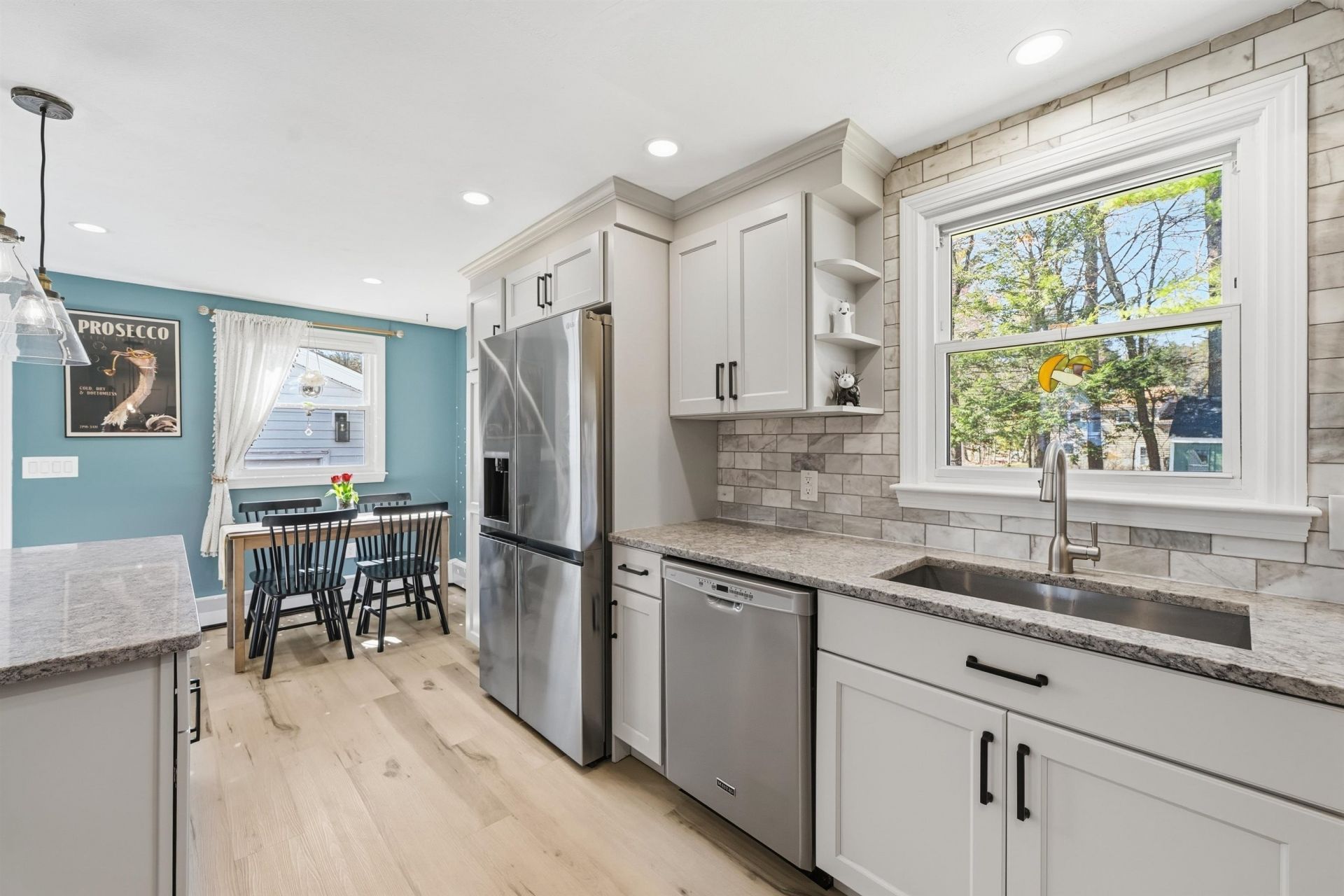 Impeccably maintained and recently renovated home in a desirable, established neighborhood. This home is move-in ready with thoughtful updates, clean turnkey systems. Enter into an open, light-filled layout anchored by an open-concept kitchen with granite counters and a large island that flows directly into the main living room, creating an effortless entertaining and everyday living space. New wide-plank flooring runs throughout the home, unifying the interiors with a warm, modern aesthetic. The home offers ample bedroom space and carefully updated bathrooms: a newly added full bathroom finished with modern tile, fixtures, and vanity, plus a beautifully renovated second bathroom with tasteful finishes including a heated mirror. Downstairs, the family room is a true gathering spot, featuring a brand-new gas fireplace with a sleek surround for cozy evenings. Major mechanicals have been upgraded for reliability and comfort, including a new boiler. Outside, enjoy a large, flat lot ideal for play, gardening, or future expansion well maintained landscaping frames a private backyard retreat with a built-in firepit, gazebo, and shed for storage. A two-car detached garage provides additional parking and workspace. This property offers it all--turnkey and ready for its new owner.