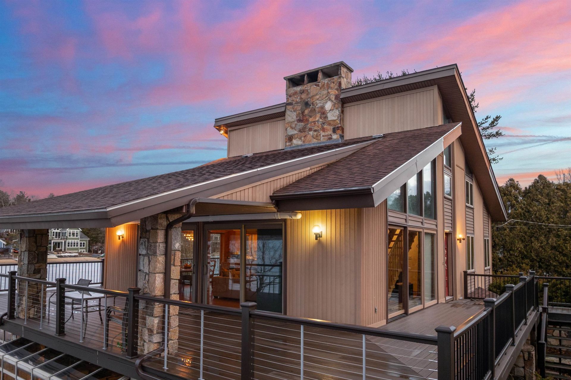 Moultonborough NH - April 11th Open House - Saturday 2:00-4:00 PM. Southwest exposure and views toward Gunstock Mountain Resort. Point location offers both sunrise and sunset views. This special setting provides all-day sun along the private sandy beach. With 220 feet of Winnipesaukee waterfront, a rare sense of privacy and light creates a distinctive connection to both home and lake. Three levels of living space with abundant glass, capturing water and mountain views from multiple vantage points around the property. The main level offers cathedral ceilings and an open-concept layout, including the living and kitchen areas, along with a primary bedroom, office, and a spacious walk-in closet for convenient single-level living.The level lot enhances usability and enjoyment of the waterfront. 2 driveways - one is gated. Dock accommodating up to a 35-foot boat historically used at the property. The entry level garden apartment has a full kitchen and could be rented as an Airbnb. 2 fireplaces. One is woodburing.In addition to your private waterfront, Balmoral has private roads, a private beach, docks, boat launch, club house and many other local activities for Balmoral Members and their Guests only. Sale is subject to a THREE-DAY Balmoral Association Right of First Refusal. Living room chandelier to be removed prior to closing. Where mornings begin with sunrise painting the sky, and evenings settle into sunset - this is a place that lives as beautifully as it looks.